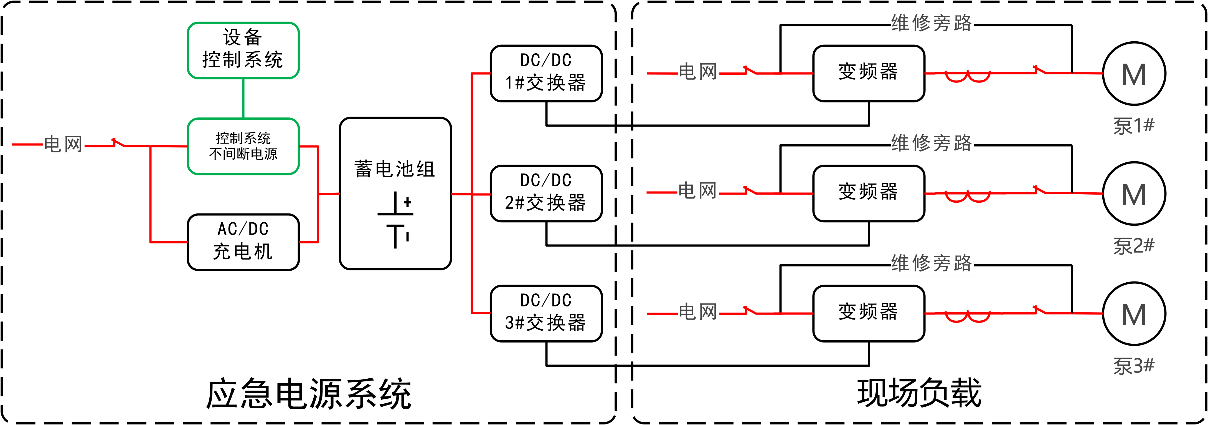 應急電源系統包含多個隔離型DC/DC變換器, DC/DC變換器熱備工作,將蓄電池的電轉化為恒定的直流電,為各變頻器提供無切換時間的直流母線支撐供電。各DC/DC變換器可獨立設置輸出電壓值。