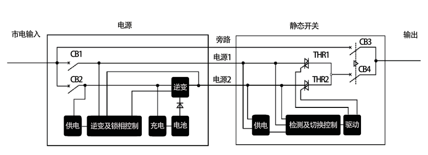 為了方便維護(hù),系統(tǒng)內(nèi)還設(shè)置有旁路開關(guān),在檢修或系統(tǒng)故障時可以繼續(xù)向負(fù)載供電。