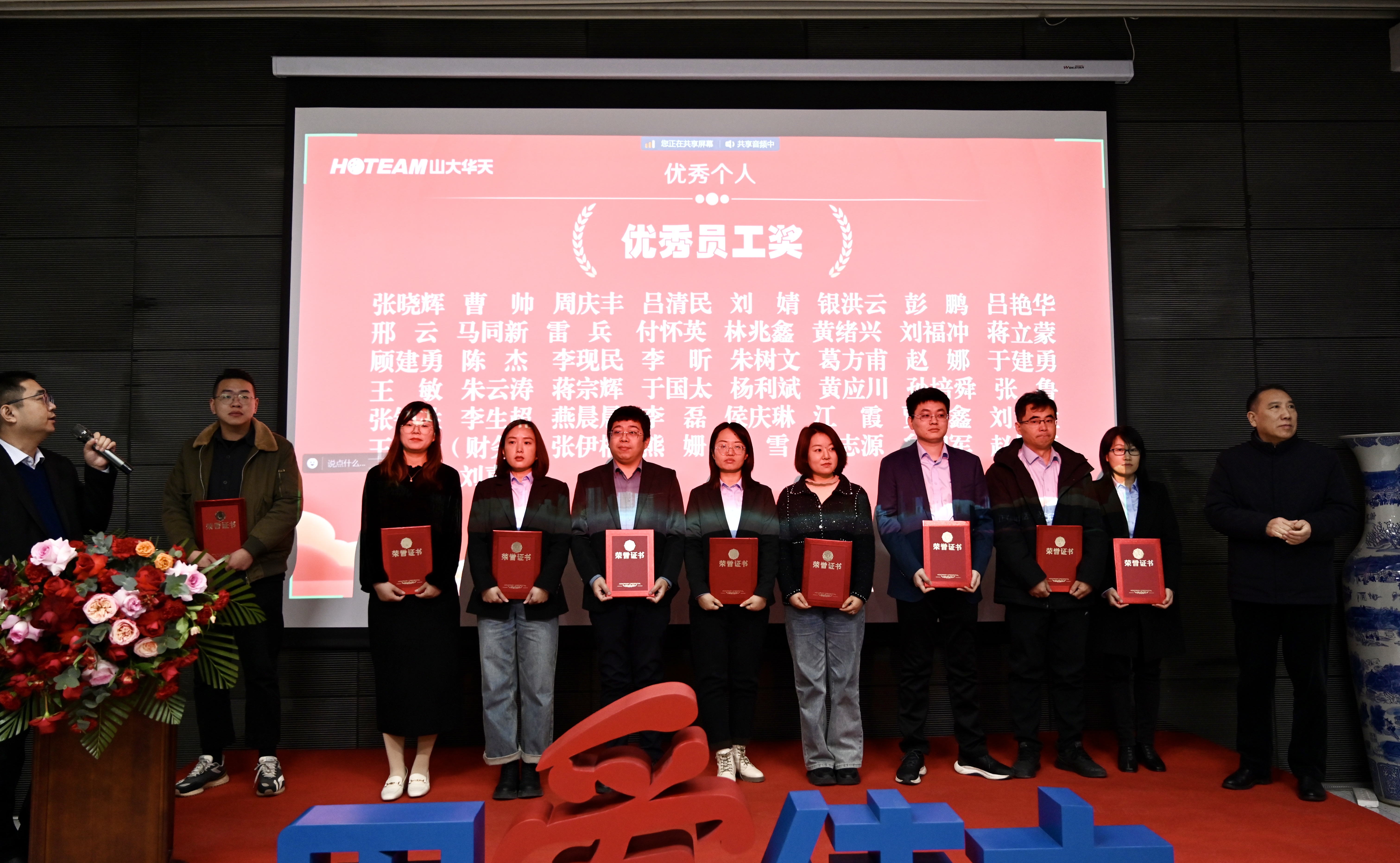 ▲集團副總裁王菲為獲得“華天標兵獎”的14名員工頒發榮譽證書。